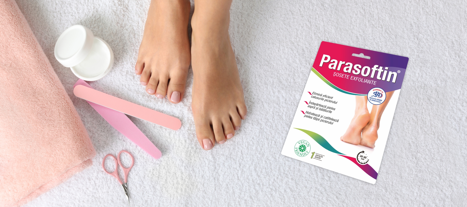 - Șosetele exfoliante, precum cele din gama Parasoftin®, asigură însă o acțiune profundă, fără frecare, și o regenerare completă a pielii în doar câteva zile, lăsând pielea netedă, hidratată și catifelată.